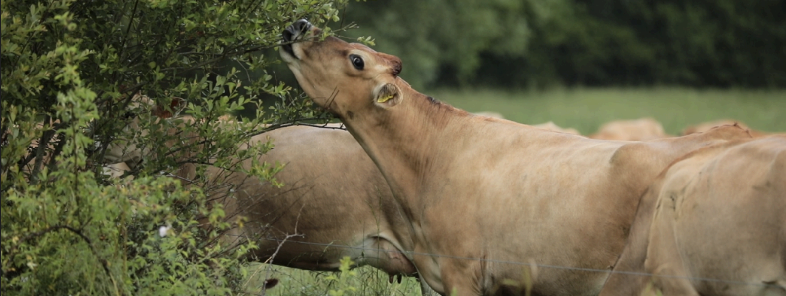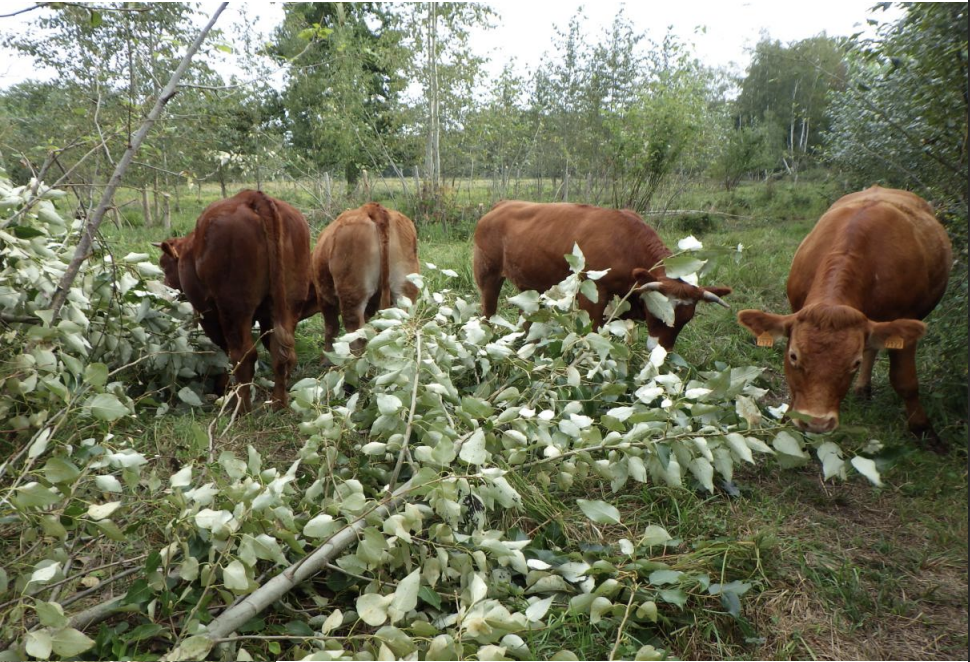 À la ferme bovine d’Adrien Messean, les arbres et les arbustes fournissent un fourrage d’appoint à ses animaux. Avec le temps, il a aménagé plusieurs sources de fourrages ligneux sur sa terre, telles que des haies arbustives, des lisières de boisé, des terrains laissés en friche, des bosquets et des arbres isolés, ou encore des trognes de saules.