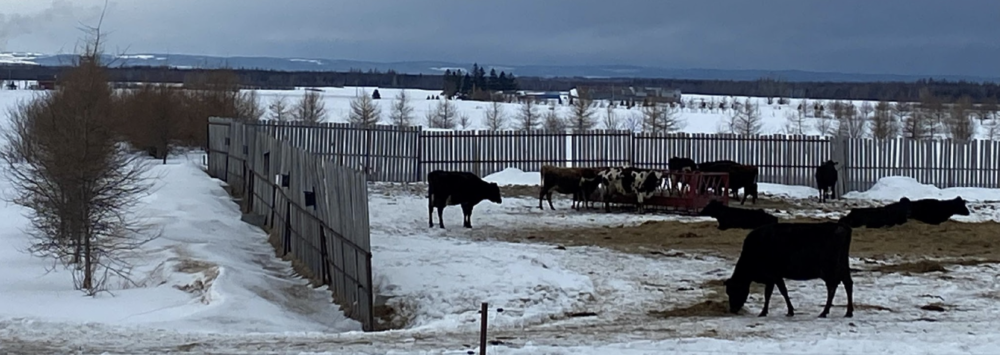 En hiver, les vaches sont gardées et nourries dans un grand enclos protégé par un brise-vent de bois, renforcé par une haie brise-vent afin de protéger le troupeau du vent. Il alimente les vaches près des murs du brise-vent pour éviter l’accumulation de la neige et ajoute de la paille aux deux jours pour garder les vaches bien au sec.